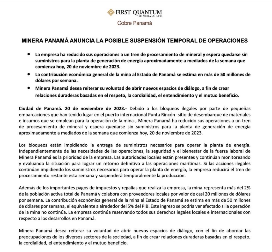 En un comunicado hoy 20 de noviembre Firts Quamtum anunciò que posiblemente Minera Panamà suspendera operaciones temporalmente debido a los bloqueos ilegales de embarcaciones que han tenido lugar en el puerto internacional Punta Rincòn- sitio de desembarque de materiales e insumos que se emplean para la operacion de la mina.